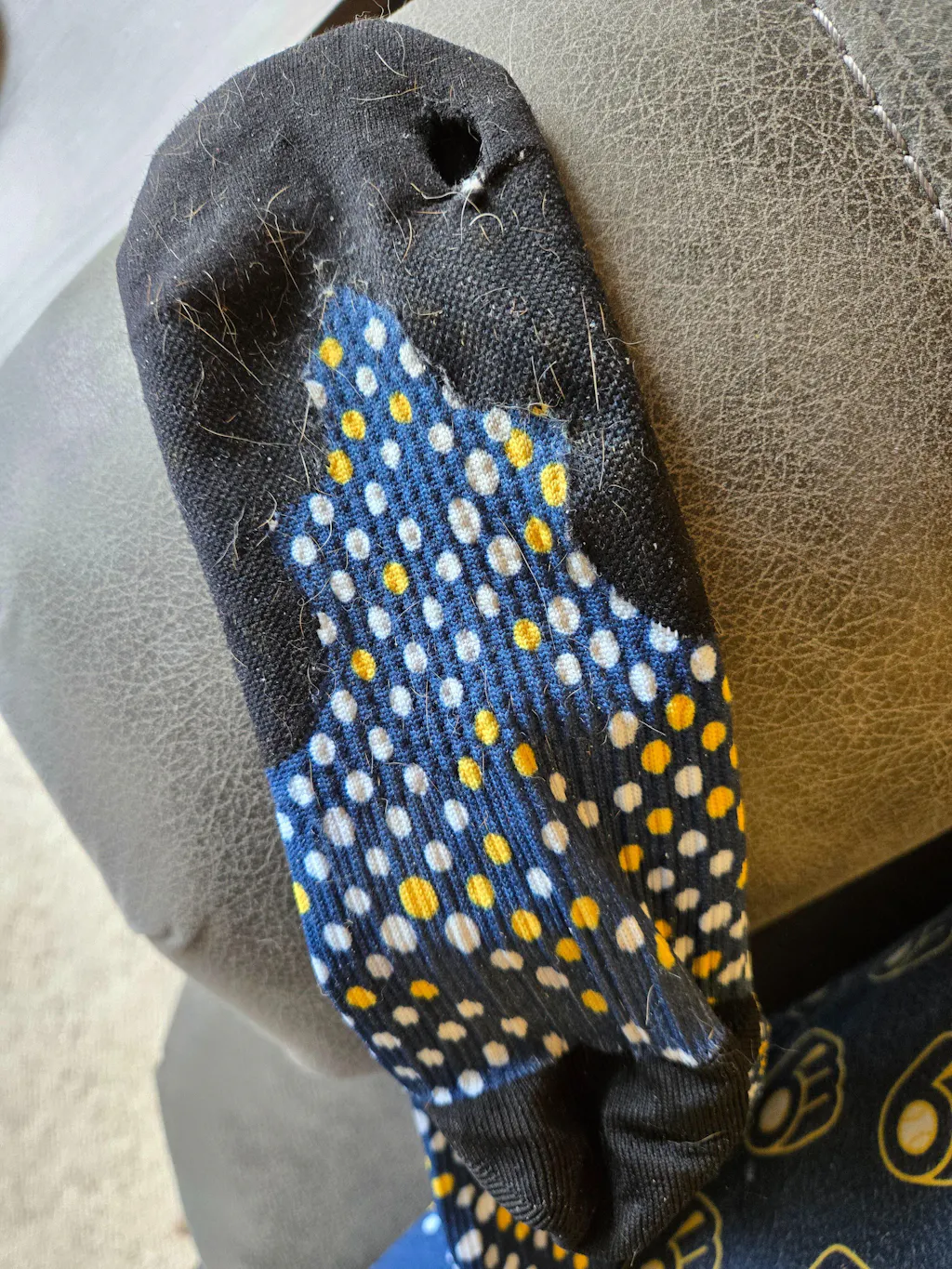 I did a review yesterday about having a hole in them after wearing 3 times. Someone texted me earlier about sending a pic of the sock with the hole. The text has disappeard from my phone before I could reply. I am attaching pics here. Sorry about the dog hair in the photos.